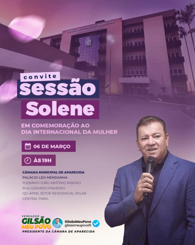 Meu povo, convido todos vocês para a Sessão Solene em comemoração ao Dia Internacional da Mulher, que acontecerá amanhã, às 19h, na Câmara Municipal de Aparecida.